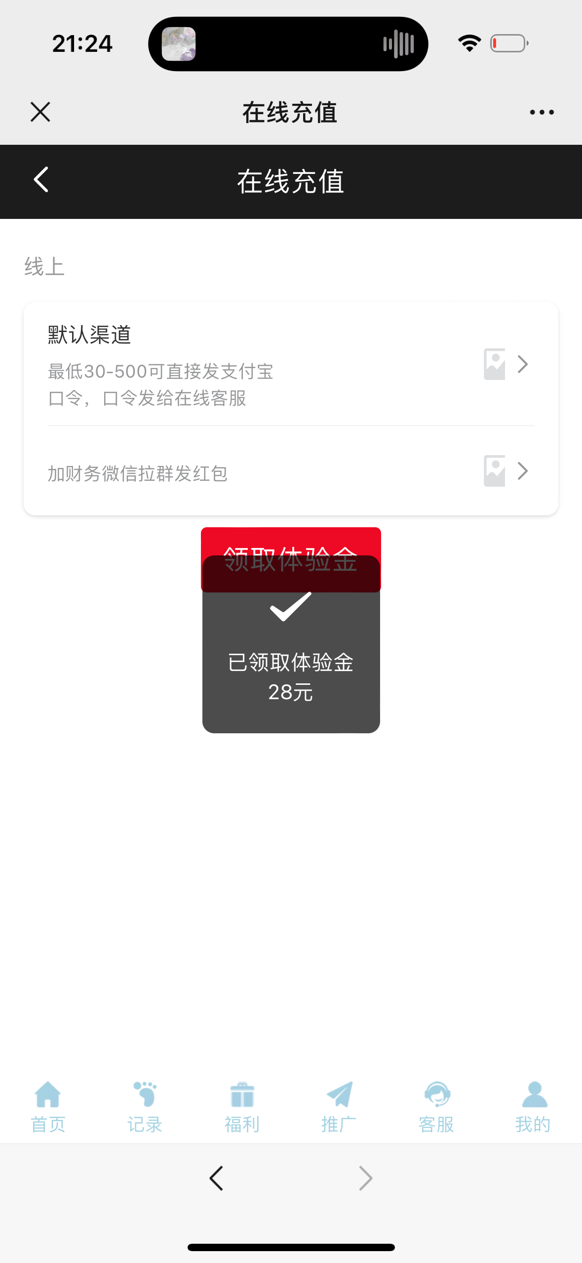 微信扫码点充值有个领取体验金