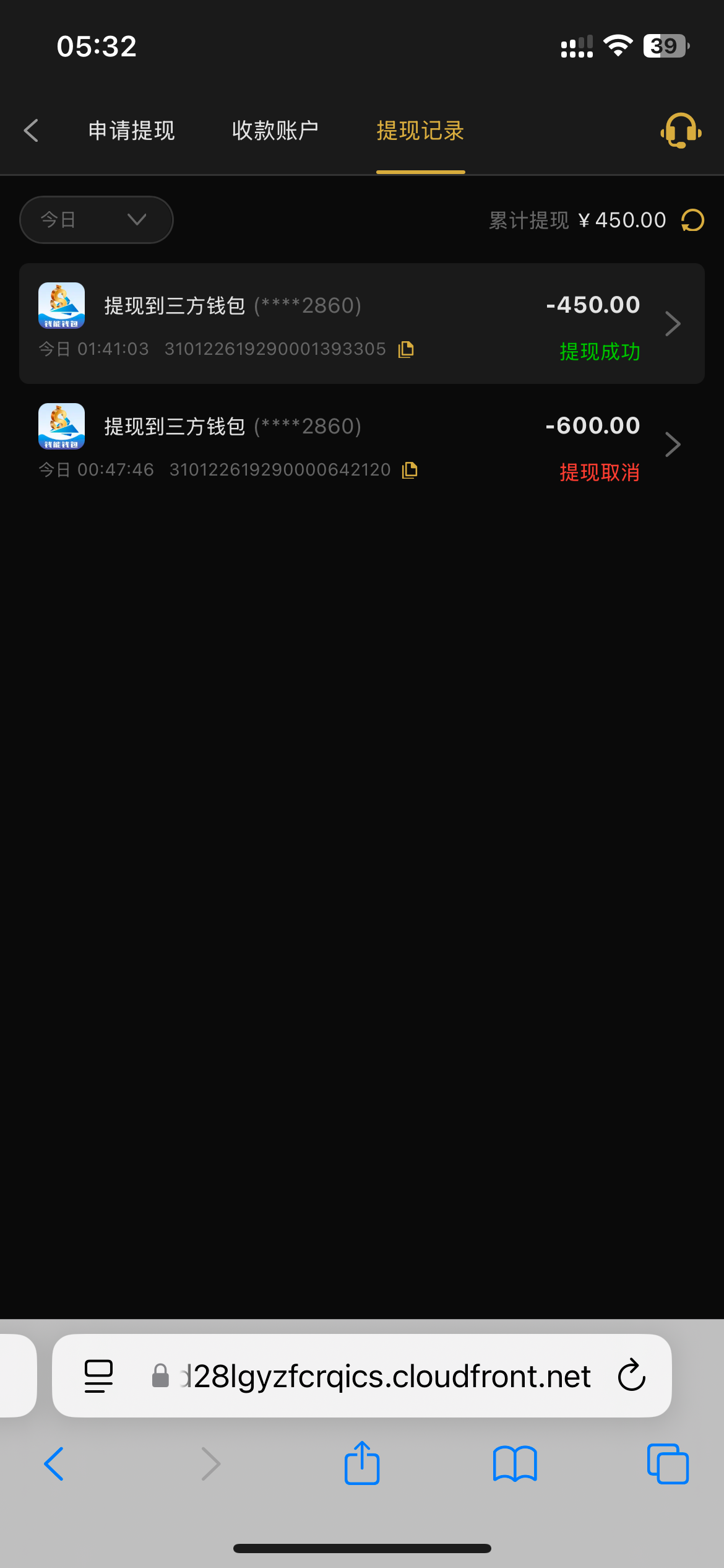 一开始提600客服说最高提现168后面600退回了我重新提了450居然给我下了 你们有短信的可以试一下 找客服碰瓷地址www.96339.locker