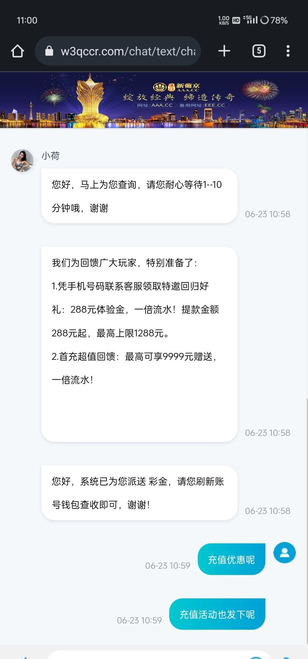 直接发手机号和ID,有就有没有就没有,我就是碰瓷的,之前输了几千块吧,可以去试试看,彩金一杯流水不限制游戏碰到应该就都是288,网址 aaa.cc