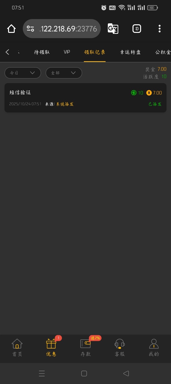 太阳城注册绑手机号秒7,点优惠再点任务领取,没打出来,黑不黑不知道