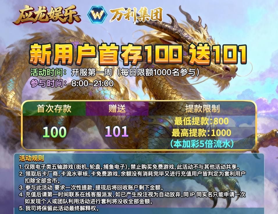 【应龙娱乐】首存100+100 注册送18