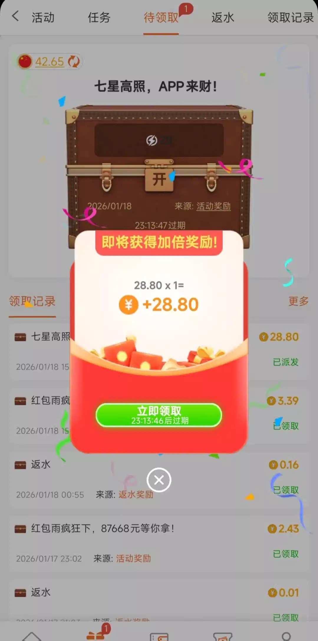 近期有充值过的可以看看,有的话下载APP才可以领,超级加倍,充1块都可以领了,我领到2个28.8