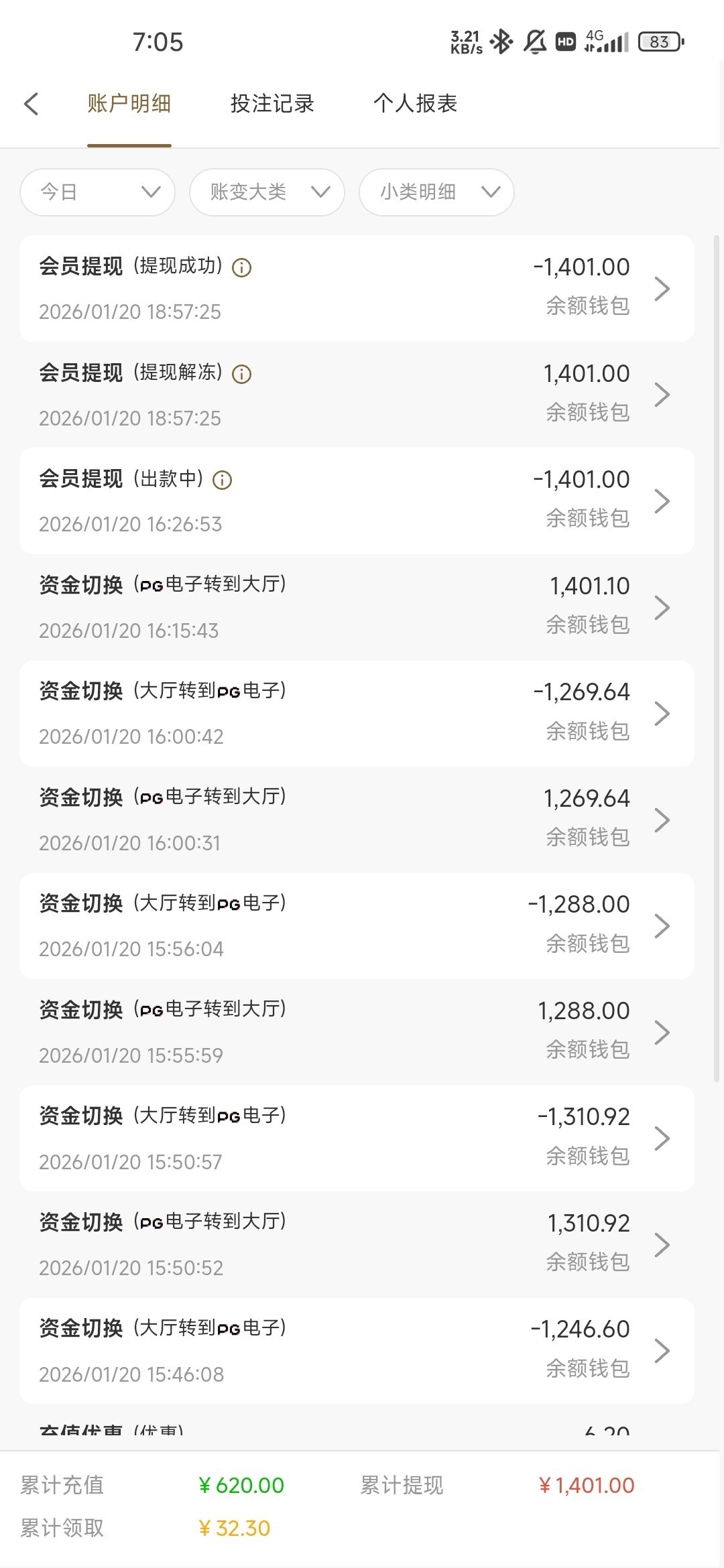 电话特邀领了26,提现需要充盈利同等金额。打到620充了620,提了1400