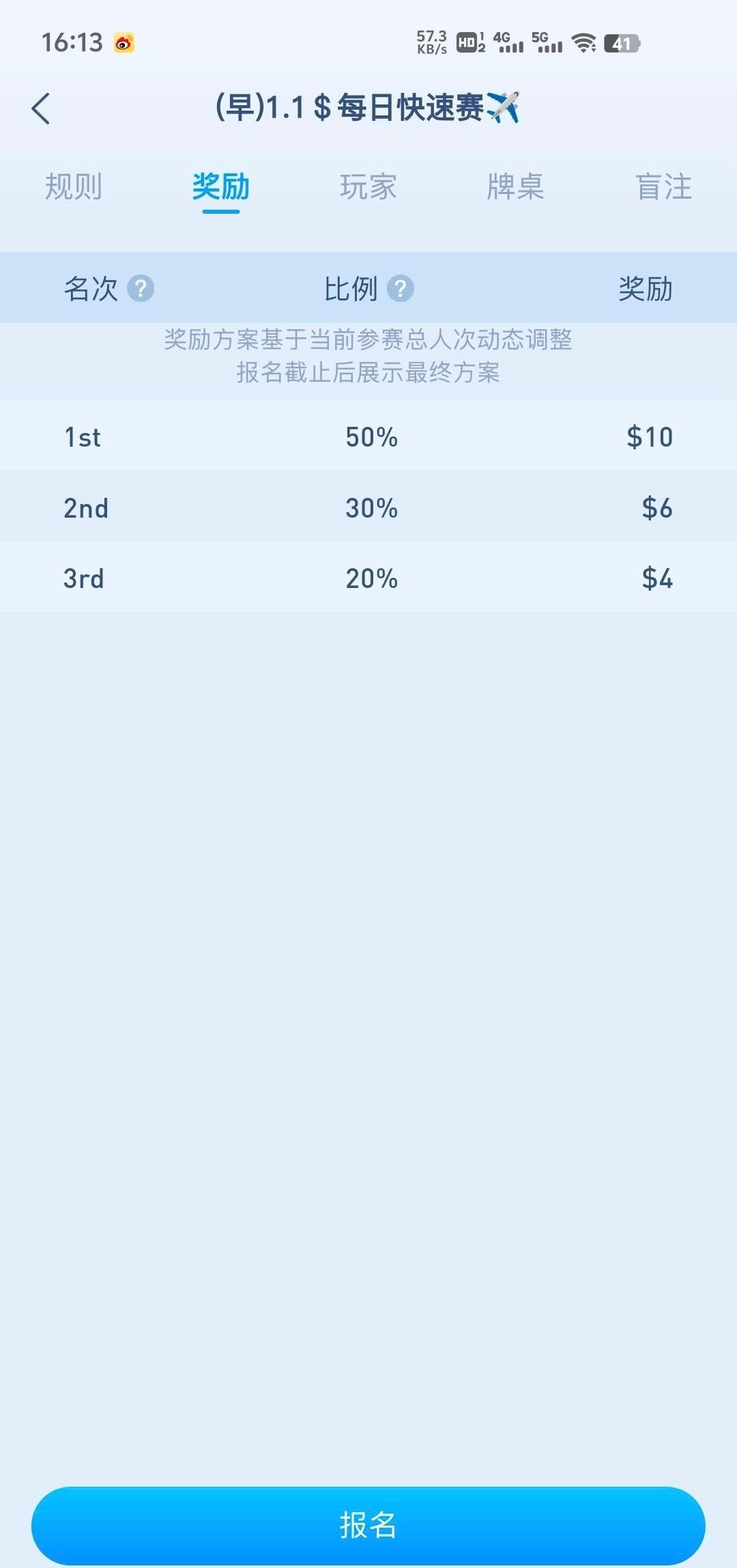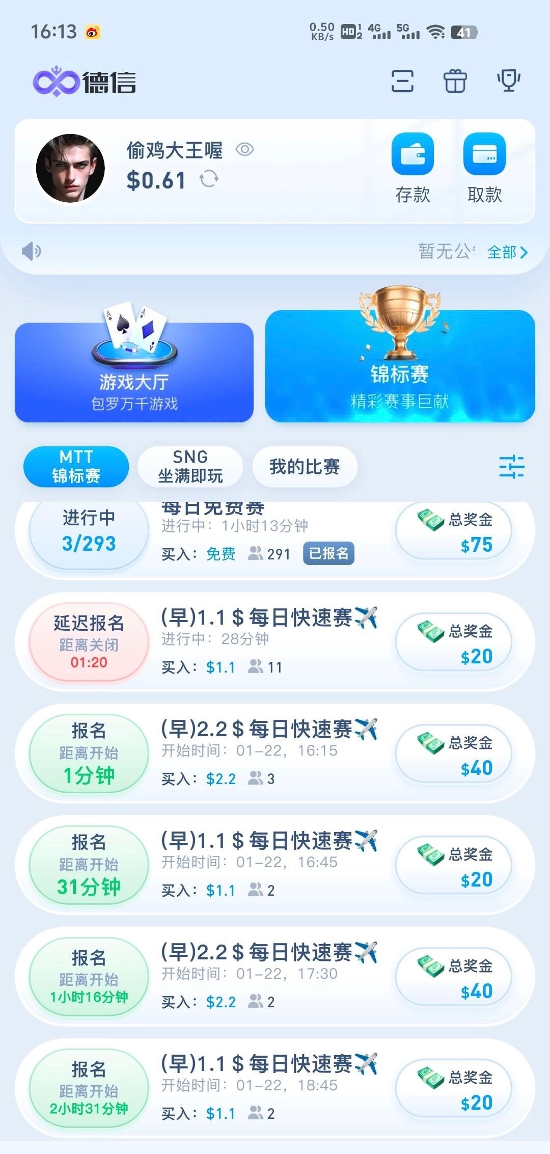这个每天有四场免费赛,12点,3点,6点,9点,只要打出够1.1u,就去打每日快速赛1.1,2.2的比赛这个基本没什么人报名玩,最多10人进,只要稳一点基本可以吃前三名,够50u就可以提了,我打了两天已经到账50,白嫖即可不要充值官网DX.vip