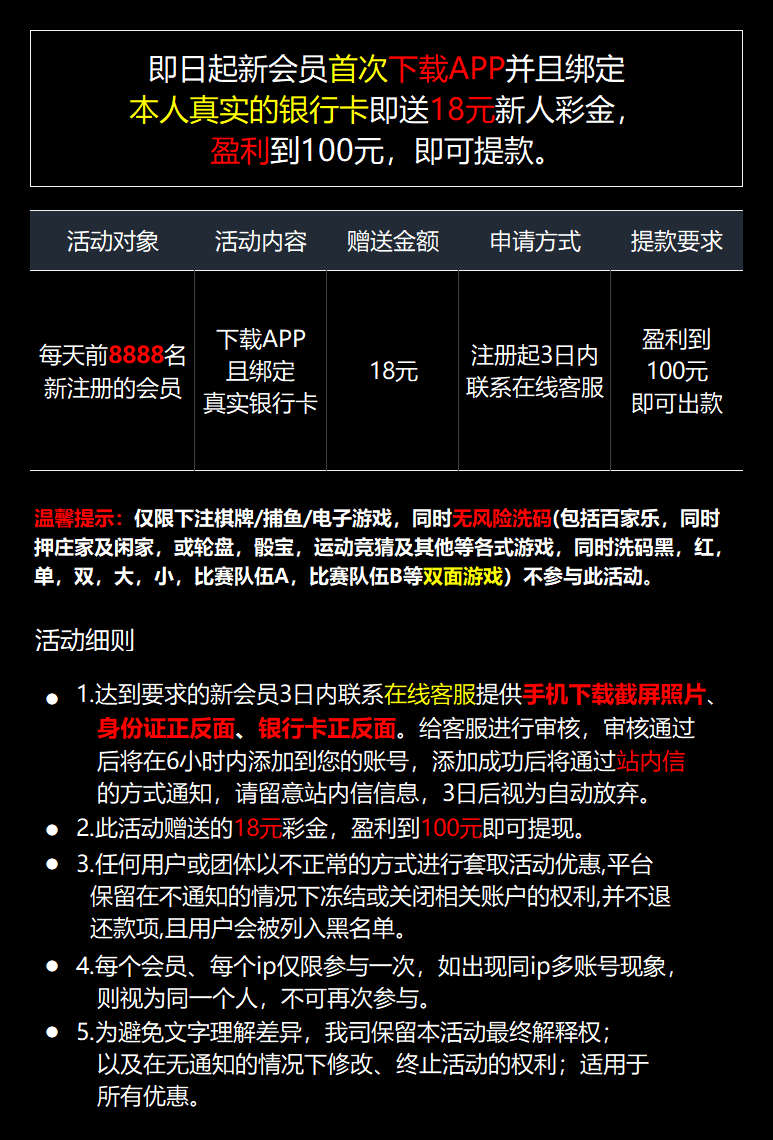 新用户下载app注册绑定手机号绑卡 联系在线客服申请18彩金  最低提款100元